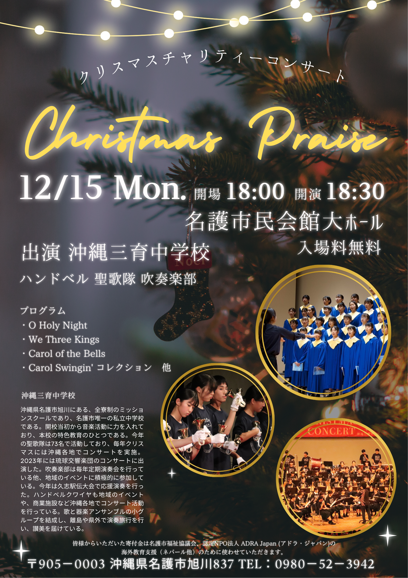 イベント 2025.11.07 12月15日(月)クリスマスコンサート 名護市民会館 12月15日(月)クリスマスチャリティーコンサート場所:名護市民会館 大ホール開場:18:00開演:18:30出演:沖縄三育中学校聖歌隊、ハンドベル部、吹奏楽部チャリティー募金の寄付先①ADRA JAPANを通じて海外教育支援②名護市社会福祉協議会