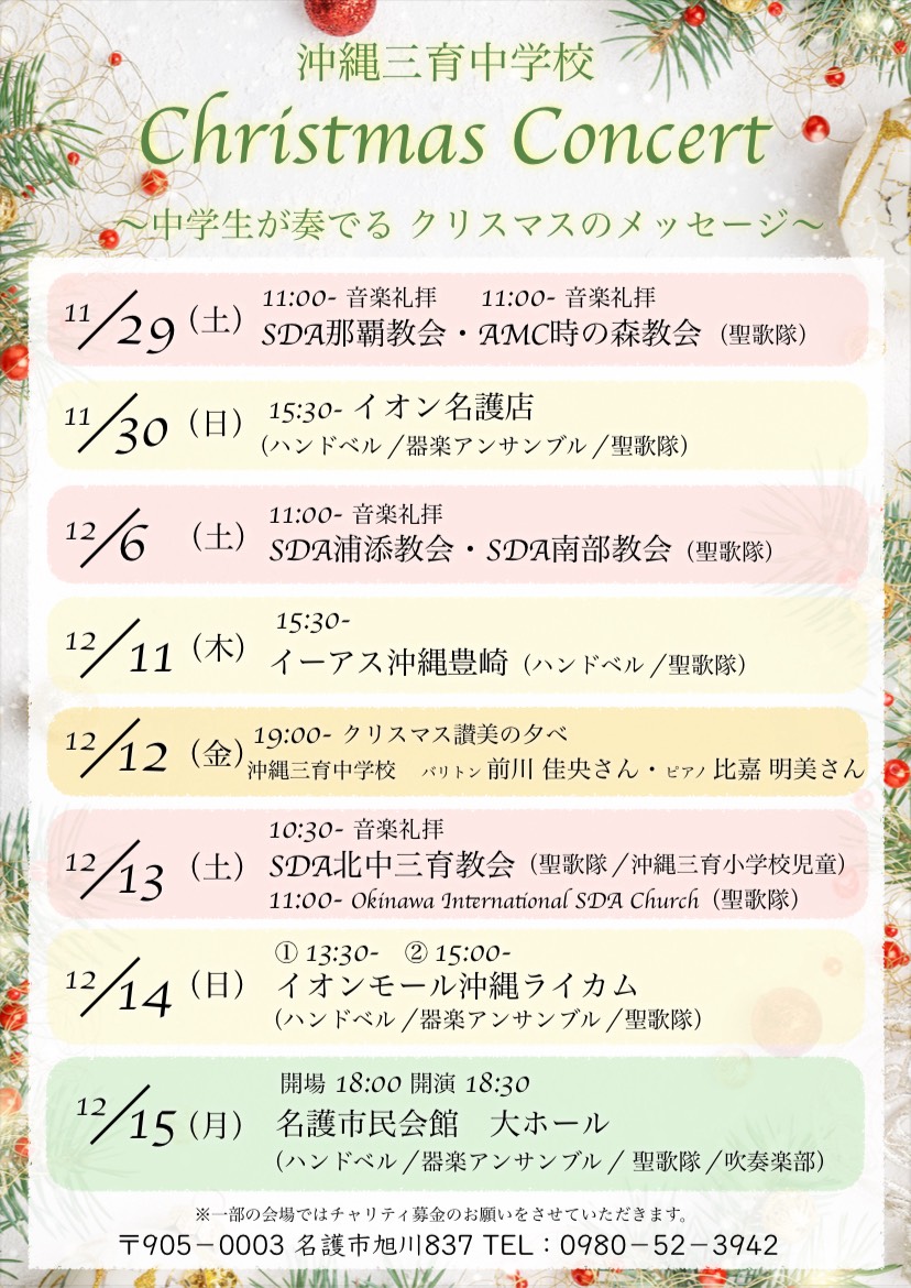 イベント 2025.11.07 クリスマスコンサート情報 沖縄三育中学校の Christmas Concert 教会での音楽礼拝もいたします。讃美歌を通して 礼拝を捧げます。 日程、時間等は以下のちらしをクリックしてご確認ください。